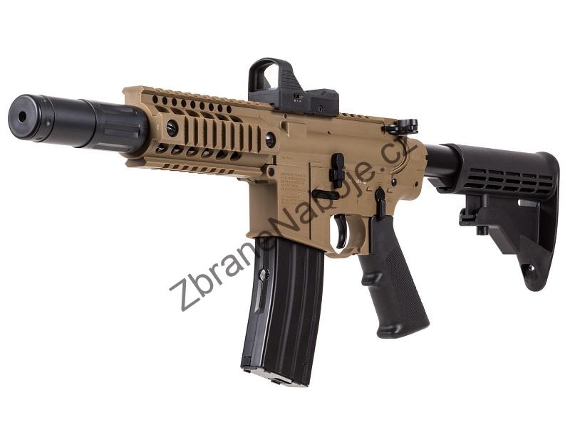 Americkým výrobcem Crosman licenčně vyráběná kopie pušky AR15. Vzduchovka s CO2 pohonem střílí 4,5 mm ocelovými broky, kterých se do zásobníku vejde 25. Střelba může probíhat jednotlivými ranami nebo PLNĚ AUTOMATICKOU DÁVKOU s kadencí až 1400 ran za minutu. Tento model je vybaven kolimátorem pro rychlé zamíření a oproti fotografii lze navíc k zaměření cíle použít laserový zaměřovač.