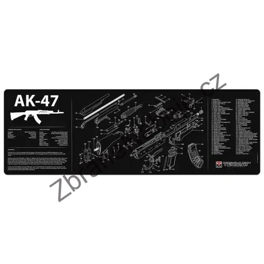 TekMat podložka pro čištění a údržbu zbraní s potiskem modelu Kalašnikov vzor 1947. Tyto 36" (91cm) podložky TekMat jsou dostatečně velké, aby se na ně vešla plně rozebraná puška a zbylo místo na nářadí a příslušenství.